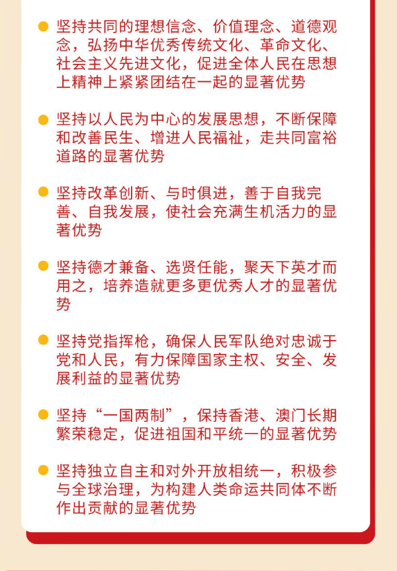 全會強(qiáng)調(diào),我國國家制度和國家治理體系具有多方面的顯著優(yōu)勢,主要是:堅持黨的集中統(tǒng)一領(lǐng)導(dǎo),堅持黨的科學(xué)理論,保持政治穩(wěn)定,確保國家始終沿著社會主義方向前進(jìn)的顯著優(yōu)勢;堅持人民當(dāng)家作主,發(fā)展人民民主,密切聯(lián)系群眾,緊緊依靠人民推動國家發(fā)展的顯著優(yōu)勢;堅持全面依法治國,建設(shè)社會主義法治國家,切實保障社會公平正義和人民權(quán)利的顯著優(yōu)勢;堅持全國一盤棋,調(diào)動各方面積極性,集中力量辦大事的顯著優(yōu)勢;堅持各民族一律平等,鑄牢中華民族共同體意識,實現(xiàn)共同團(tuán)結(jié)奮斗、共同繁榮發(fā)展的顯著優(yōu)勢;堅持公有制為主體、多種所有制經(jīng)濟(jì)共同發(fā)展和按勞分配為主體、多種分配方式并存,把社會主義制度和市場經(jīng)濟(jì)有機(jī)結(jié)合起來,不斷解放和發(fā)展社會生產(chǎn)力的顯著優(yōu)勢;堅持共同的理想信念、價值理念、道德觀念,弘揚(yáng)中華優(yōu)秀傳統(tǒng)文化、革命文化、社會主義先進(jìn)文化,促進(jìn)全體人民在思想上精神上緊緊團(tuán)結(jié)在一起的顯著優(yōu)勢;堅持以人民為中心的發(fā)展思想,不斷保障和改善民生、增進(jìn)人民福祉,走共同富裕道路的顯著優(yōu)勢;堅持改革創(chuàng)新、與時俱進(jìn),善于自我完善、自我發(fā)展,使社會充滿生機(jī)活力的顯著優(yōu)勢;堅持德才兼?zhèn)洹⑦x賢任能,聚天下英才而用之,培養(yǎng)造就更多更優(yōu)秀人才的顯著優(yōu)勢;堅持黨指揮槍,確保人民軍隊絕對忠誠于黨和人民,有力保障國家主權(quán)、安全、發(fā)展利益的顯著優(yōu)勢;堅持“一國兩制”,保持香港、澳門長期繁榮穩(wěn)定,促進(jìn)祖國和平統(tǒng)一的顯著優(yōu)勢;堅持獨立自主和對外開放相統(tǒng)一,積極參與全球治理,為構(gòu)建人類命運(yùn)共同體不斷作出貢獻(xiàn)的顯著優(yōu)勢。這些顯著優(yōu)勢,是我們堅定中國特色社會主義道路自信、理論自信、制度自信、文化自信的基本依據(jù)。