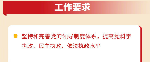 全會提出,堅持和完善黨的領(lǐng)導(dǎo)制度體系,提高黨科學(xué)執(zhí)政、民主執(zhí)政、依法執(zhí)政水平。必須堅持黨政軍民學(xué)、東西南北中,黨是領(lǐng)導(dǎo)一切的,堅決維護(hù)黨中央權(quán)威,健全總攬全局、協(xié)調(diào)各方的黨的領(lǐng)導(dǎo)制度體系,把黨的領(lǐng)導(dǎo)落實到國家治理各領(lǐng)域各方面各環(huán)節(jié)。要建立不忘初心、牢記使命的制度,完善堅定維護(hù)黨中央權(quán)威和集中統(tǒng)一領(lǐng)導(dǎo)的各項制度,健全黨的全面領(lǐng)導(dǎo)制度,健全為人民執(zhí)政、靠人民執(zhí)政各項制度,健全提高黨的執(zhí)政能力和領(lǐng)導(dǎo)水平制度,完善全面從嚴(yán)治黨制度。