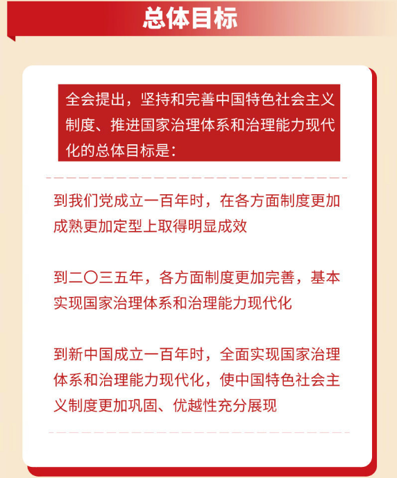 全會提出,堅持和完善中國特色社會主義制度、推進(jìn)國家治理體系和治理能力現(xiàn)代化的總體目標(biāo)是,到我們黨成立一百年時,在各方面制度更加成熟更加定型上取得明顯成效;到二〇三五年,各方面制度更加完善,基本實現(xiàn)國家治理體系和治理能力現(xiàn)代化;到新中國成立一百年時,全面實現(xiàn)國家治理體系和治理能力現(xiàn)代化,使中國特色社會主義制度更加鞏固、優(yōu)越性充分展現(xiàn)。